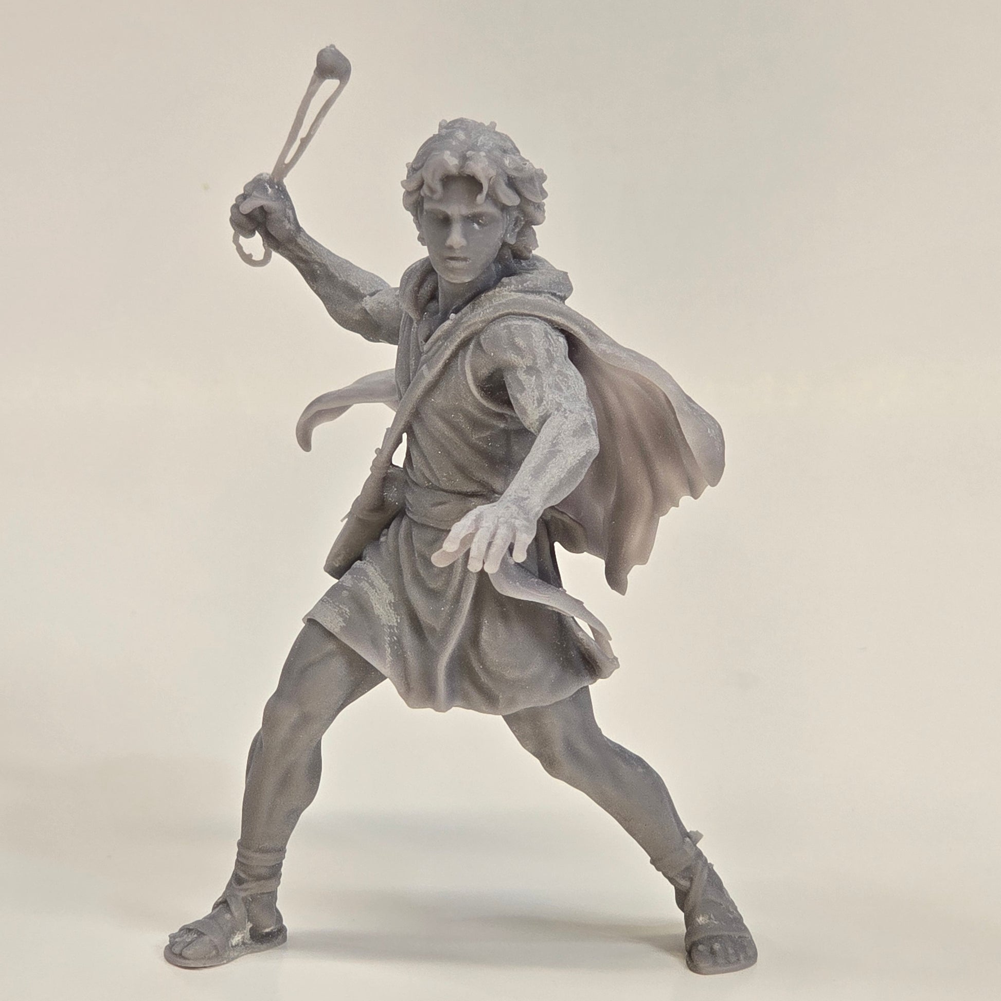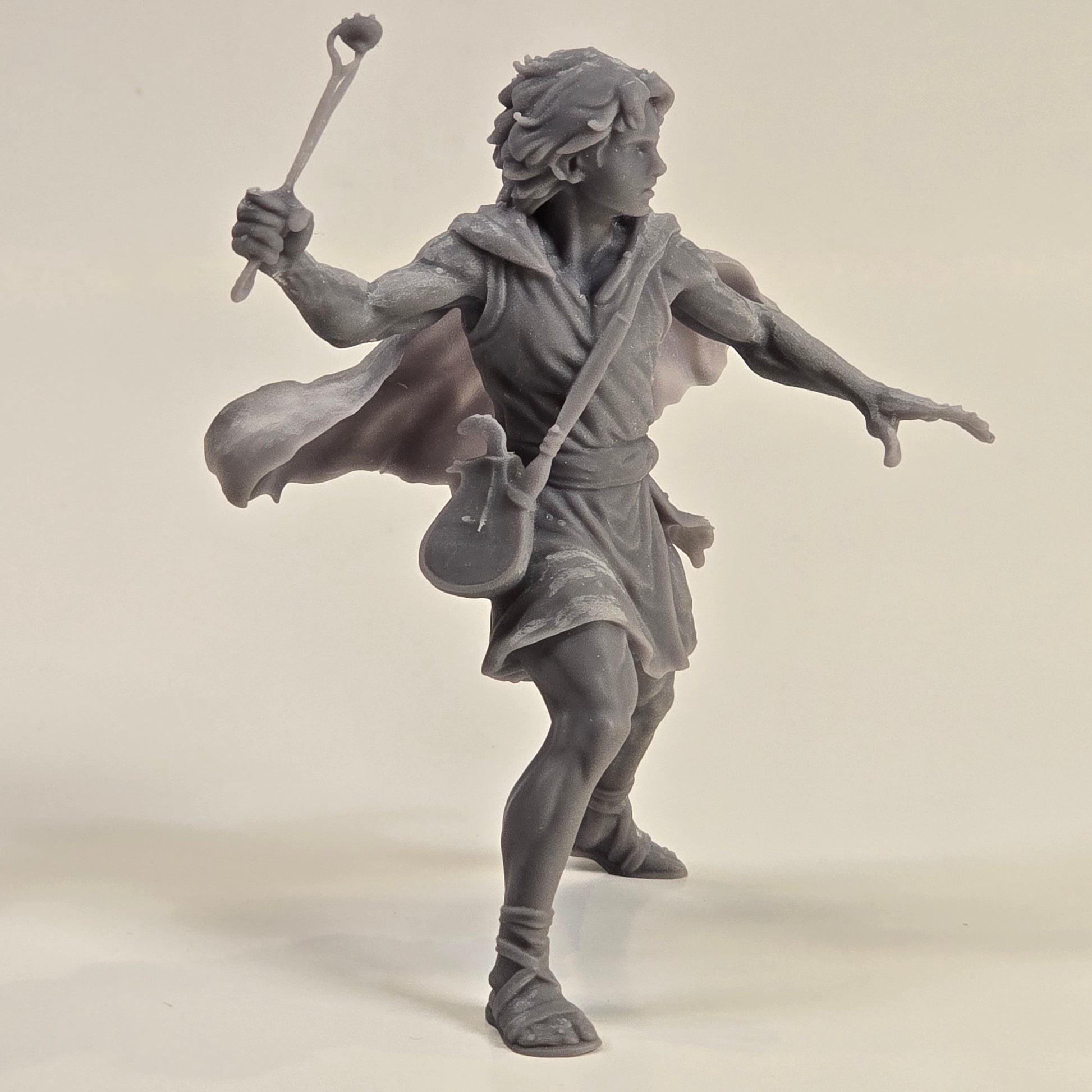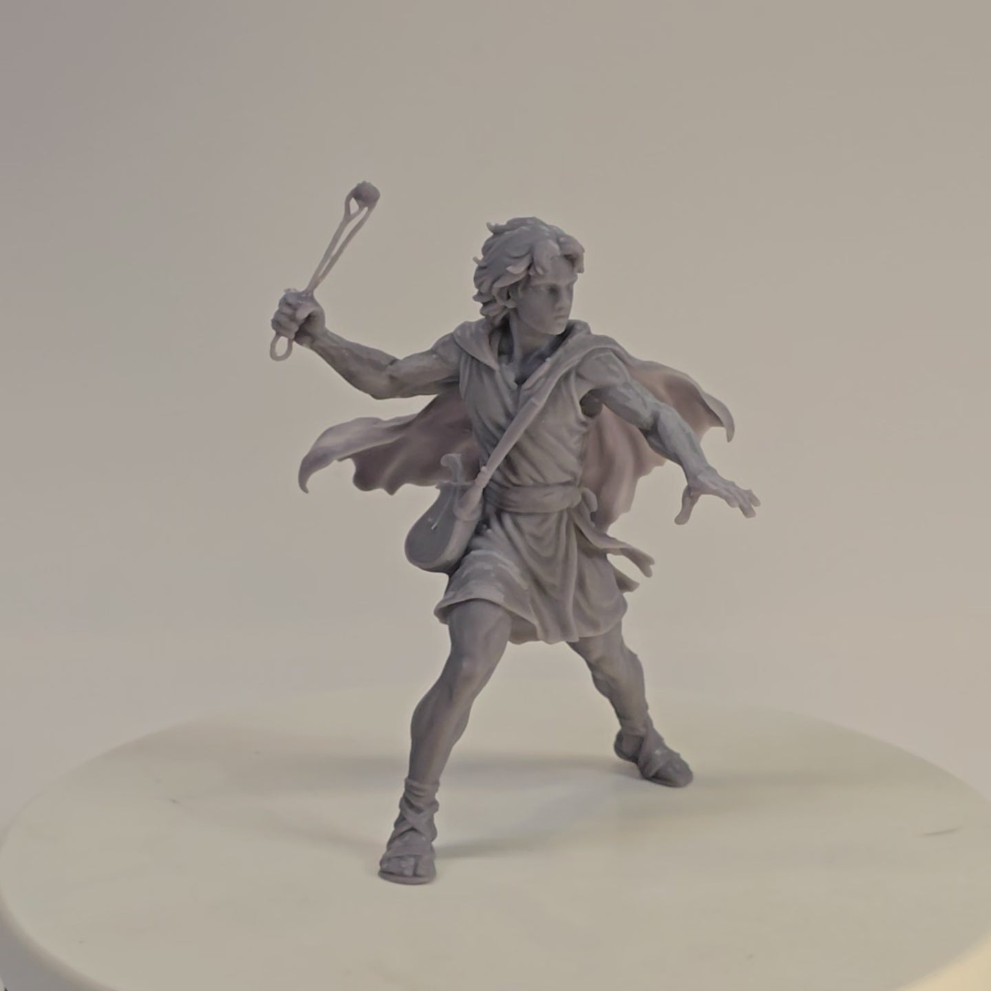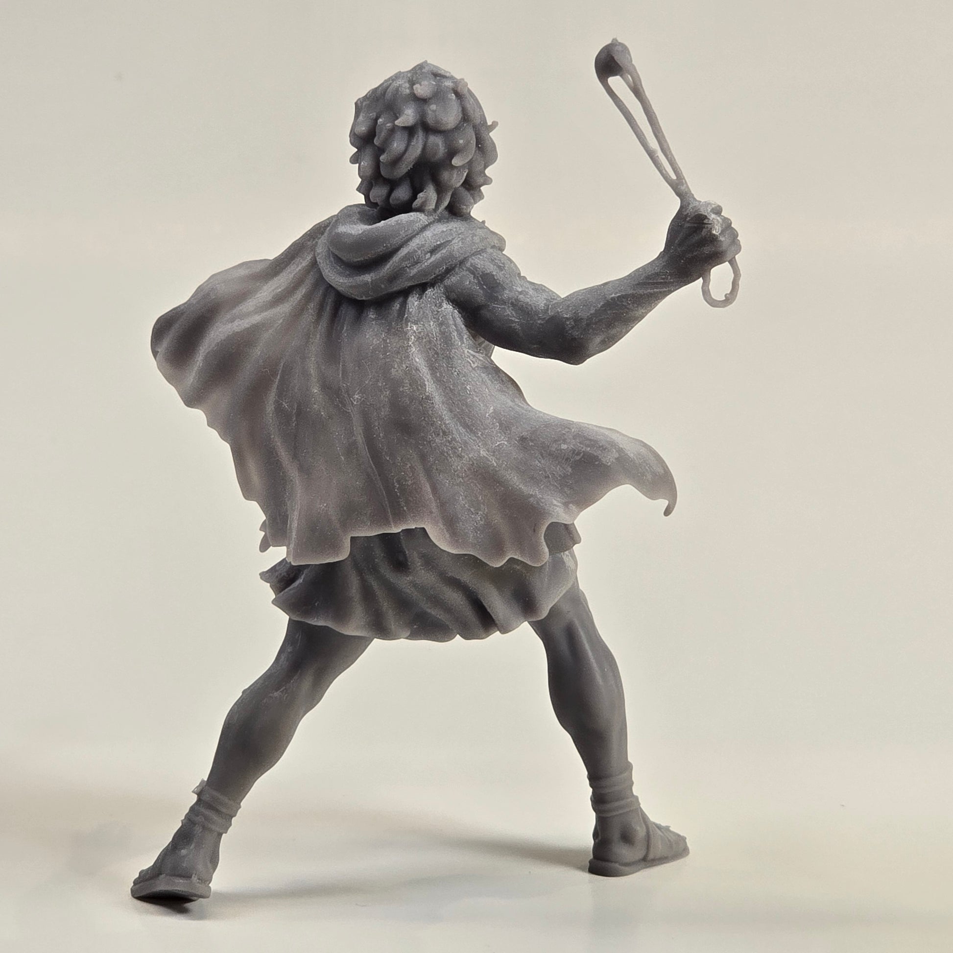 75mm sculptural grey resin figure of David the Shepherd with sling drawn, cloak flowing, and lifelike pose—collector-scale miniature for painting or display.